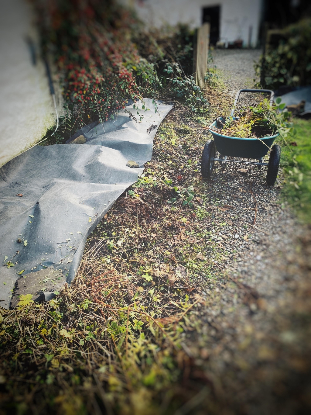 In the photographs below you can see that Herbie the Hedgehog has the new herb patches marked out and sheeted over for winter to clear the grass, while the plots we already have are mulching away nicely. In spring, we’ll be raising mint and lemon balm from root divisions and young plants in small standing greenhouses. Verbena will stay snug in the greenhouse too, as it doesn’t care for the cold — rather like Rachel!